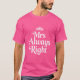 This cheeky bride’s shirt reads “Mrs. Always Right” in elegant script, with a tiny crown icon perched on the letters. The white text on soft pink keeps it sweet yet funny. It’s an adorable gag gift for the bride at bridal showers or bachelorette parties, playfully declaring who’s boss in the marriage!