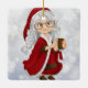 She has long wavy grey hair and large glasses, holding a drink in both hands. The background features softly falling snowflakes, creating a whimsical winter.