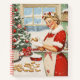 In a cosy, snow-covered kitchen, Mrs. Claus is captured in the midst of holiday baking. Dressed in a festive red dress with fur-trimmed sleeves, and a matching apron, she smiles warmly as she prepares a fresh batch of cookies. The scene is filled with Christmas cheer, complete with a beautifully decorated tree adorned with candy canes and red ornaments, while snow gently falls outside the window, adding to the magical atmosphere of the season.