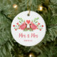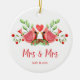 Decorate your tree with this "Mrs & Mrs" design, featuring a pretty watercolor of two red cardinals. The lovebirds are face to face, perched on seasonal evergreens with a heart in between them. Underneath "Mrs and Mrs" is written in fun modern typography and you can personalize with the couple's first names. On the back there's a small coordinating red heart and you can add the Christmas year or other text. Perfect for newly married brides.