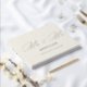 Mrs. & Mrs. Elegant Calligraphy Cream White Gold Foil Wedding Guest Book with custom names, wedding date and wedding location