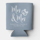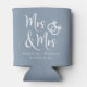 Give your wedding guests a toast and a fun souvenir keepsake of your special day with these custom dusty blue can coolers with "Mrs & Mrs" written in a large white script and an illustration of two diamond wedding rings joined together. Add your names and wedding date.