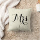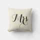 Mrs. Pillow in black on light beige background colour, with striped black and light beige back. Part of a Mr. and Mrs. pair. Customisable. Background colour, text, and text colour can be changed.
