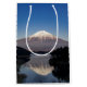 Majestic Mt Fuji reflected in Lake Tanuki and framed by the river banks at nightfall.
