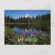 A gorgeous photo of Mt Hood reflected in Mirror Lake with pink wildflowers in the foreground.
