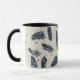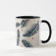A coffee mug featuring a denim blue and red fern design