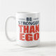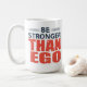 This mug design features the empowering phrase "BE STRONGER THAN EGO," designed to inspire and motivate with every sip. The text is displayed in bold, all-capital letters, with "BE STRONGER" in a navy-blue tone and "THAN EGO" in a bright, attention-grabbing red. The distressed font adds a raw, dynamic edge to the design, conveying strength and resilience. Subtle horizontal lines above and below the top phrase create balance and draw focus to the message. This design combines simplicity with impact, making it perfect for daily motivation at home, the office, or as a thoughtful gift.