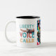 The "Liberty's Voice Calls" mug design features a compelling and inspirational illustration. The mug showcases a striking image of the Liberty Bell, with its iconic crack and detailed texture, set against a backdrop of dynamic, swirling waves of colour that symbolise the powerful resonance of freedom. The phrase "Liberty's Voice Calls" is elegantly wrapped around the bell in a classic, vintage-style font. The design uses a rich colour scheme of deep blue, bold red, and crisp white, reflecting a sense of patriotism and pride. This mug is perfect for enjoying your favourite beverage while celebrating the enduring spirit of liberty.
