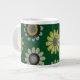 Yellow daisies on a green background. Photograph of afghan done is daisy pattern. Background is green with flowers in yellows, browns, tan, grey, and greens
