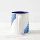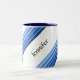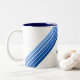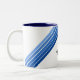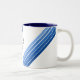 Blue lines in varying five shades of blue. Dark to light, bottom to top. Two Sets of stripes are placed diagonally from top to bottom of mug. Personalise with name in centre.