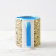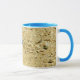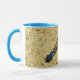 Dragonfly sitting on the sand, a shadow is visible beneath the body. This insect, of the order Odonata, has transparent wings and large eyes. The bright blue of the body is picked up in the colour the mug's rim and handle. Great gift for the entomologist in your life.