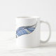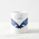 Feather with blue barbs making up the vane. Two feathers cross at the base of the calamus (shaft). The tips of the feathers rise upwards to the right and left of centre. Between the feathers is the name that you edit.