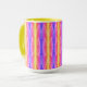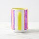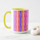 Woven pattern in shades bright pastel colours (pink, blue, yellow). Kaleidoscopic pattern resembles snake skin, with its converging chevron shapes. Bright yellow divides the pattern into strips.