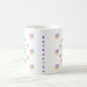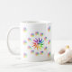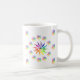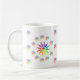 Colour wheel is created with rainbow coloured graphic leaves. One large wheel in centre, smaller motifs arranged around this in a circle. Medium motifs at side edges. This pattern is repeated on both sides. Personalise with vertical name in blue between designs. ***Part of coordinated set - BKM1c.