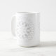Mandala design with four pattern rings. Central circle of six segments, next circle has six ovals with circles inside. Eleven small sunbursts inside band that is trimmed with tiny circles. Fifteen diamond petals holding a circle create the outer ring. Simple, elegant design that is replicated on both sides of mug.