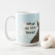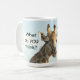 Classic coffee mug features "head shot" of giraffe looking straight into the camera with the text (customisable): "What do YOU think? The eyelashes--too much for this early in the day?" Cute and funny coffee mug.