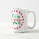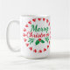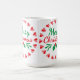 The mug is adorned with a winter-themed background, such as snowy pine trees or a cosy fireplace. The text “Merry Christmas” is prominently displayed in elegant, swirling script, with festive colours like red and green. Surrounding the text, small details such as snowflakes, holly leaves, or twinkling stars add a festive touch. For a playful twist, include cute characters like Santa, reindeer, or a snowman peeking from the sides. The handle could be designed to resemble a candy cane, adding to the holiday spirit.