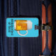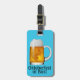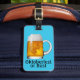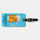 Sky blue luggage tag with a photo of a glass mug of beer, on the front and custom black text, on the front and back. Personalise the text to read what you want.