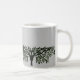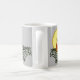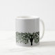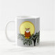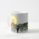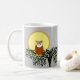 Owl sitting on branch in front of a full moon. Cartoon drawing. Bird is brown with white face and yellow feet, yellow moon with golden edges and branch is black silhouette. Empty tree branches on opposite side Background is light grey.