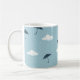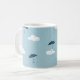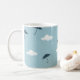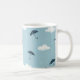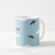 Create a seamless rain pattern featuring raindrops, umbrellas, and puddles, with some clouds and soft ripples. Use a cool colour palette with shades of blue, grey, and white for a calming, refreshing atmosphere.