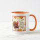 This two-tone mug has a nice fall leaves and turkey print with holiday greeting of "Happy Thanksgiving". Inside shown in orange with orange handle.