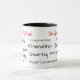 This mug is shown with a black interior and black handle along with encouraging words of "The spice of life" shown in red and words of "kindness, family, laughter, generosity, good food, friendship, good conversations" and so on in black text of varying sizes.