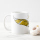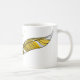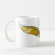 Feather with yellow barbs making up the vane. Two feathers cross at the base of the calamus (shaft). The tips of the feathers rise upwards to the right and left of center. Between the feathers is the name that you edit.
