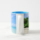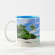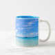 A mug with blue interior and a tropical print of sea, sand/beach, trees and palm tree on the exterior. Text reads: "Relax and enjoy the best of life."