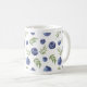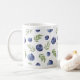Mug with watercolor blueberries. Beautiful midsummer design. There are blueberries and green leaves all over it.