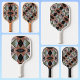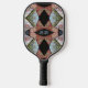 A Pickleball paddle designed with embroidered floral pillows in a patchwork pattern, it's a fun and beautiful illusion that is both traditional and boho chic. Deep, rich earthy multi colour different patterns on each side of the of the paddle in beautiful patterns accented with black..
