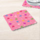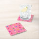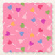 Paper coasters featuring fun multi-colour (pink, red, purple, green, yellow) heart lollipops / suckers scattered on a pink background. Great for a Valentine's Day themed party or event.