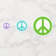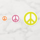 Peace signs in a rainbow of bright colours. Pink, orange, yellow, green, blue, and purple.