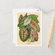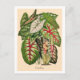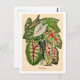 A fine art botanical postcard with an illustration of multi-coloured caladiums in red, green and white.