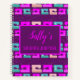 Colourful sewing journal notebook printed on both sides with rows of pretty sewing machines, winding thread, and Needles. The front of the notebook also features a box with the recipient's name, and the words Sewing Journal. Customise by changing the name, and also the journal's title if you wish.