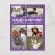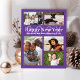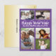 Family photo collage postcard with "happy new year" text and year numbers behind. Purple cards with white text for the greeting and signature. There is plenty of space to include names of kids and pets. Upload five favourite photos to the templates provided and share stories from the past year in pictures! Reverse is gradient gold colour with a place to type in a mailing address - which will have to be done individually for each address. OR, delete that text and hand write after ordering.