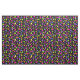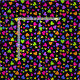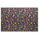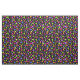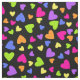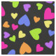 A pattern of tossed hearts in pink, orange, yellow, green, blue and purple colours on a black background.