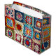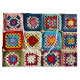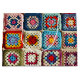 A vibrant collection of handmade crocheted granny squares features colourful patterns