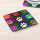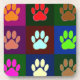 A colourful dog paw print pattern in pink, orange, blue, yellow and other colours.