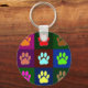 A colourful dog paw print pattern in pink, orange, blue, yellow and other colours.