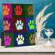 A colourful dog paw print pattern in pink, orange, blue, yellow and other colours.