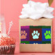 A colourful dog paw print pattern in pink, orange, blue, yellow and other colours.