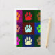 A colourful dog paw print pattern in pink, orange, blue, yellow and other colours.