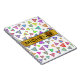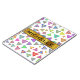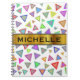 This notebook design features an eyecatching pattern involving many triangles of different sizes and different colours. It also features a personalised name within a faux gold coloured area.