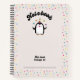 A spiral bound notebook featuring a very cute penguin juggler with multicolour polkadots on the front and back covers.