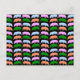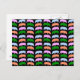 This postcard features a series of different coloured cartoon style pigs. Each has its head down ready to gobble up whatever food it can find. The hogs are in alternating lines of pink and blue and green and orange.