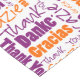 Your personal gratitude table cloth is designed with a orange and purple multilingual typography word cloud design over a white background.
