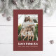 Retro style "love from us" with two photos on the back. Background colour is editable; burgundy