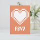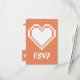 This fun and geeky RSVP card features a coral background and a large 8-bit heart in white on the front. A coral border along the bottom edge of the card with a pattern of white video game related icons, including joysticks, D-pads, computer mice, and pixel hearts, decorates the back with some sample text in place above that can be customised to fit your needs.