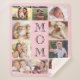 A modern photo collage pink keepsake blanket that your mum will treasure and enjoy for years. You can personalise with 10 family photos. "MOM" is written vertically down the middle in elegant typography.