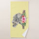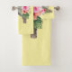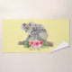 Towels with an adorable watercolor design. Koala bear mum and baby. Baby is riding on momma's back. Standing on a tree branch. A hibiscus flower bouquet below. Banana yellow background.